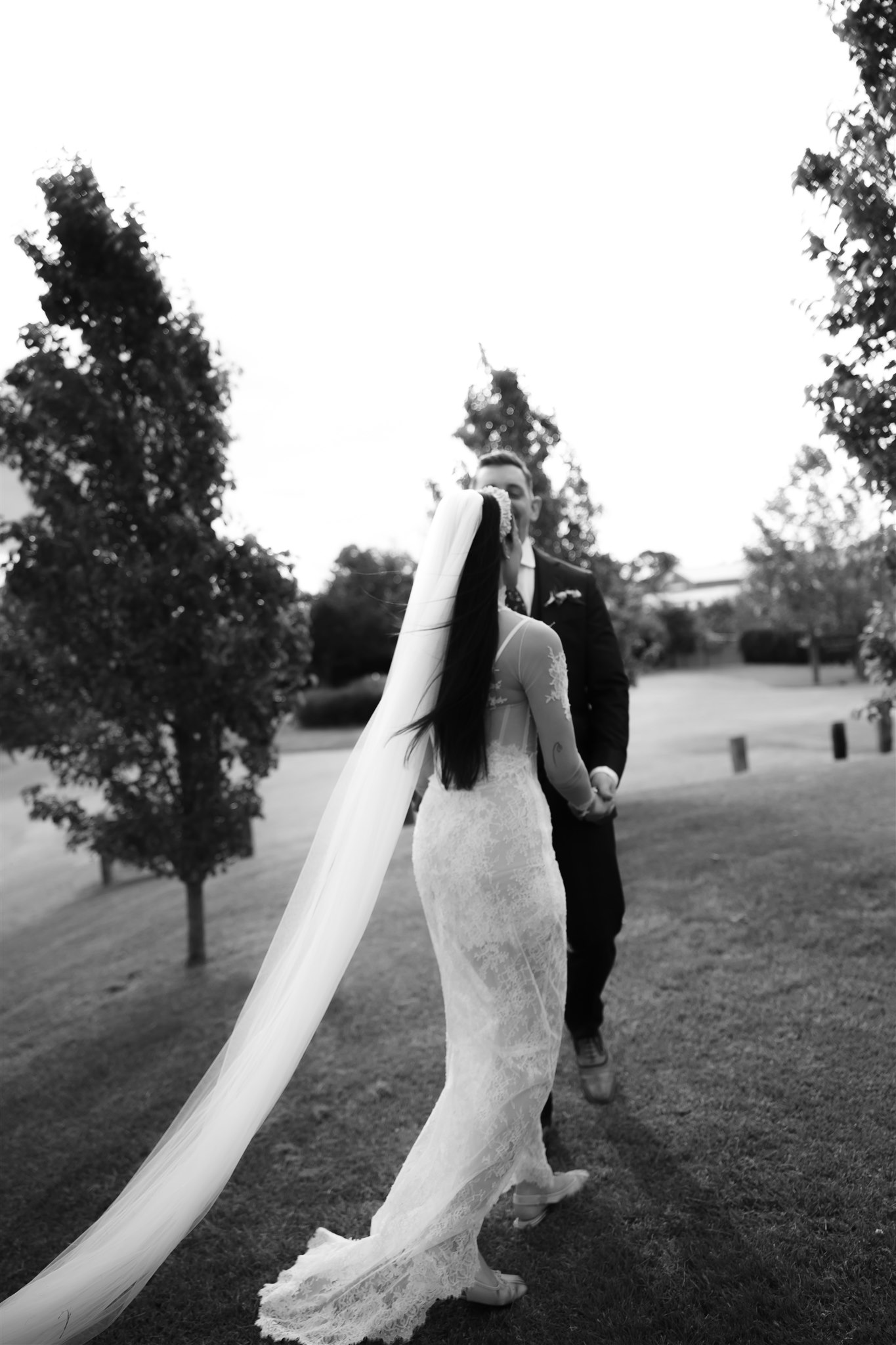 Natalie crafted her beautiful wedding veil and wedding dress herself drawing inspiration from Dana Harel Design and Kim Kassas Couture. Her three piece set featured a peach nude tulle corseted mini dress and an ivory tulle and appliqué lace overskirt and delicate bolero. To complete her bridal outfit, Natalie wore a yellow native frangipani head garland woven together by her mother bringing an element of her Kiribati background to her wedding outfit.